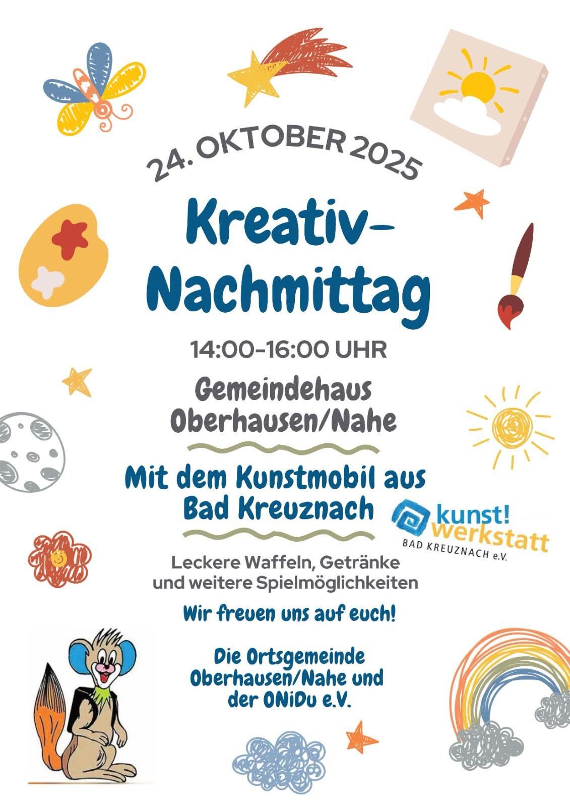 am Freitag, den 24. Oktober 2025 wird es bei uns im Gemeindehaus so richtig bunt und kreativ. Die Ortsgemeinde Oberhausen/Nahe und unser ONiDu e.V. freuen sich riesig, euch alle zu einem besonderen Kreativ-Nachmittag einzuladen. Wir haben uns extra das tolle Kunstmobil der Kunstwerkstatt Bad Kreuznach e.V. organisiert, das von 14:00 bis 16:00 Uhr direkt vor dem Gemeindehaus Oberhausen/Nahe Halt macht!