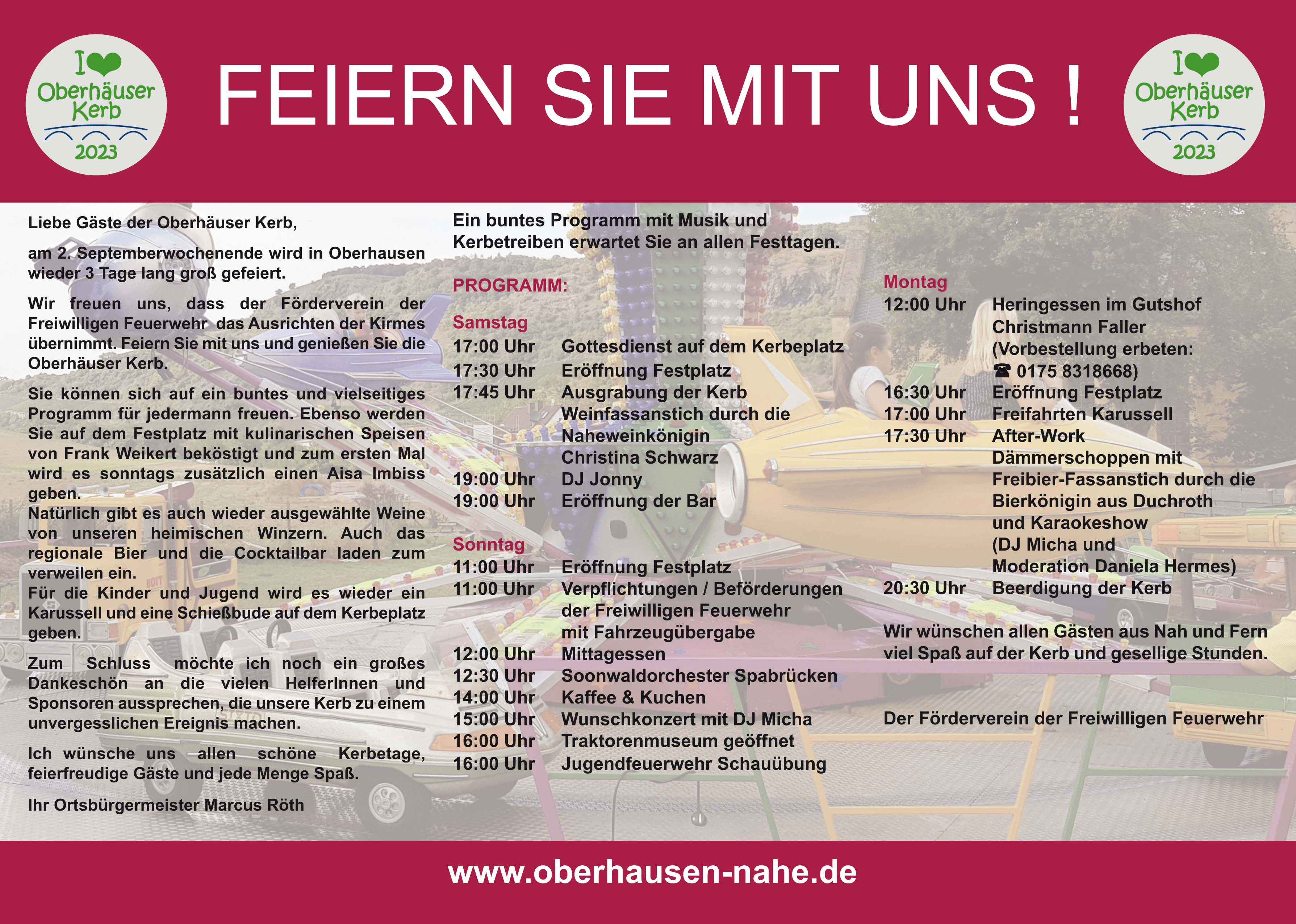 Dann ab nach Oberhausen auf die Kerb. Ein vielfältiges und buntes Rahmenprogramm mit Musik und Kerbetreiben erwartet Sie an allen Festtagen.